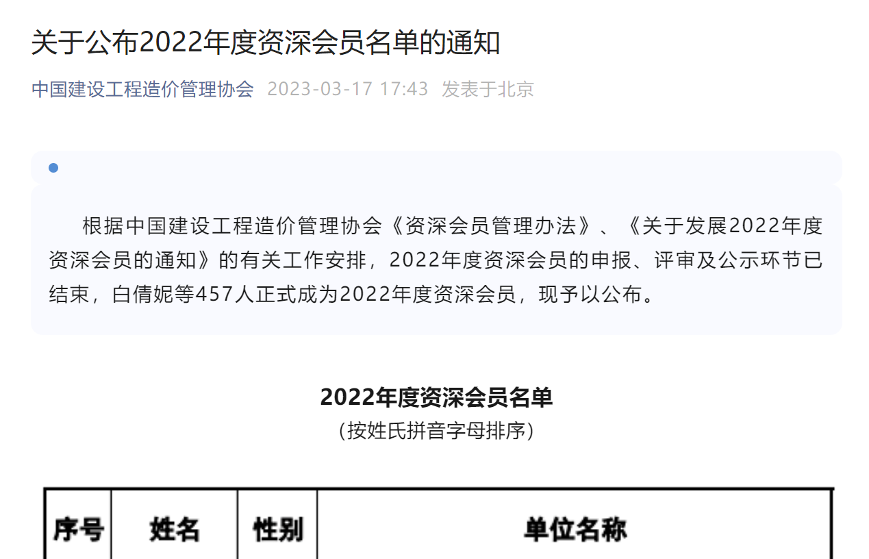 根据中国建设工程造价管理协会《资深会员管理办法》、《关于发展2022年度资深会员的通知》的有关工作安排,2022年度资深会员的申报、评审及公示环节已结束,在公布的名单中,我集团副总经理陆冬、总经理助理谢宇翔正式成为中国建设工程造价管理协会资深会员。