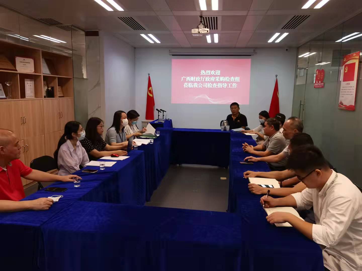 8月13日上午,广西壮族自治区财政厅政府采购检查组莅临我公司进行年度检查现场查验工作。我公司总经理陈浩、副总经理黄艺组织公司政府采购工作相关人员积极配合检查组开展工作。