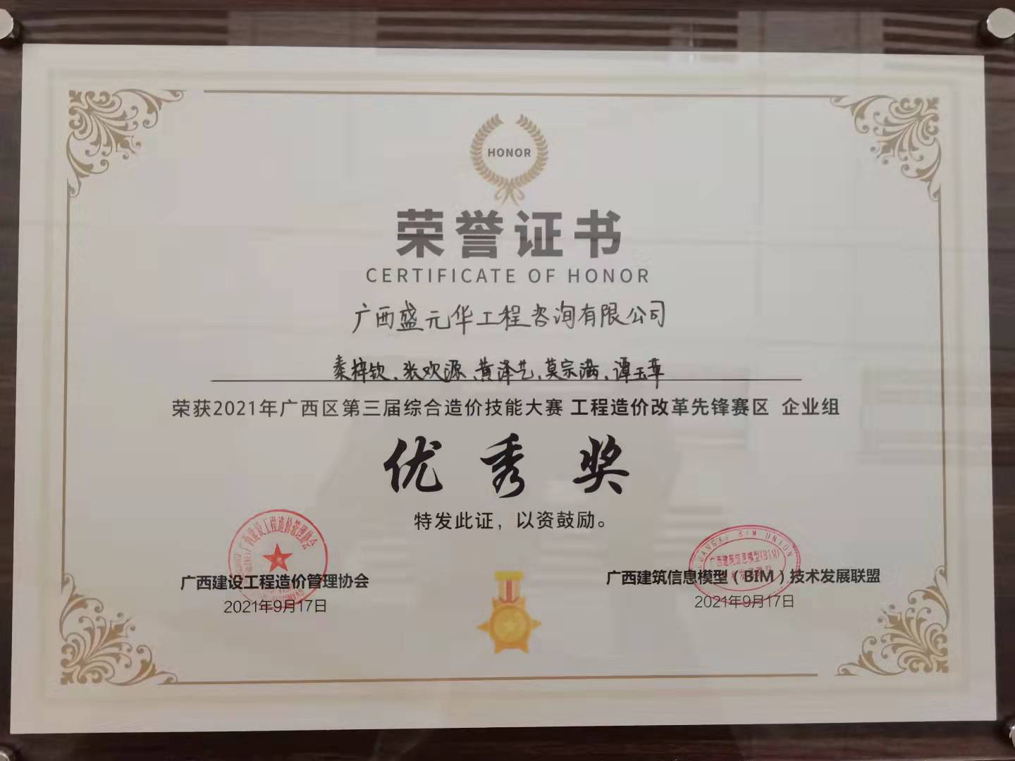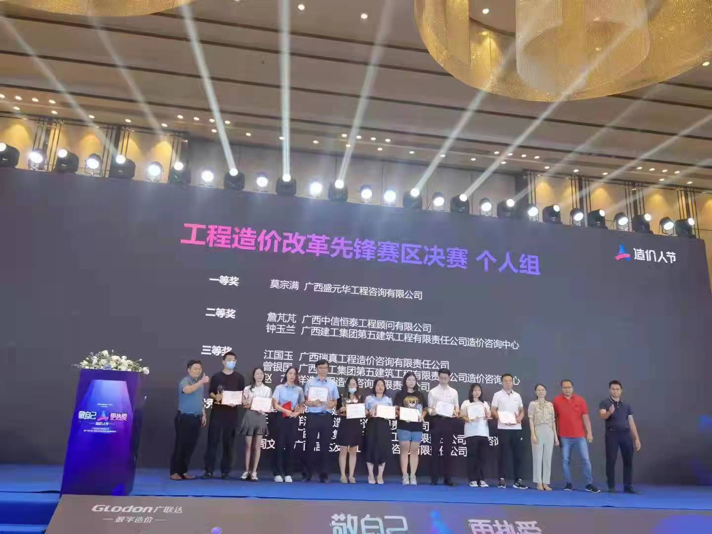 2021年广西区第三届综合造价技能大赛(以下简称“大赛”)的系列比赛已全部结束,在9月17日的颁奖典礼上,公司参赛团队以优异的成绩在本届技能大赛中再次收获荣誉:荣获工程造价改革先锋赛区个人组第一名和企业组优秀奖、企业数字化开拓者赛区企业组三等奖。