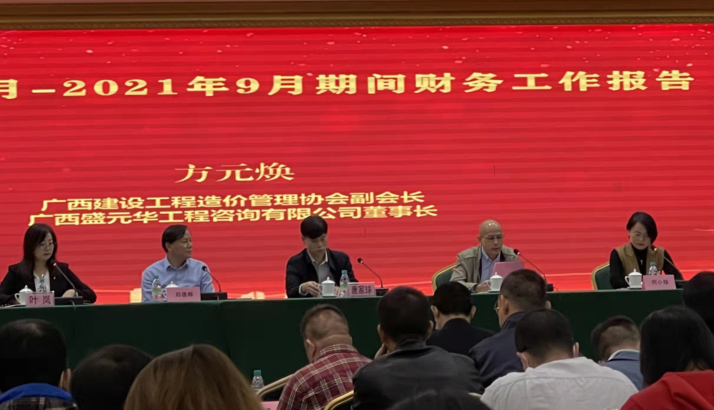 广西建设工程造价管理协会第五届第二次理事会暨第五届第二次会员代表大会于2021年11月2日在南宁隆重召开,会上我公司董事长方元焕作为协会副会长在会上作财务工作报告。