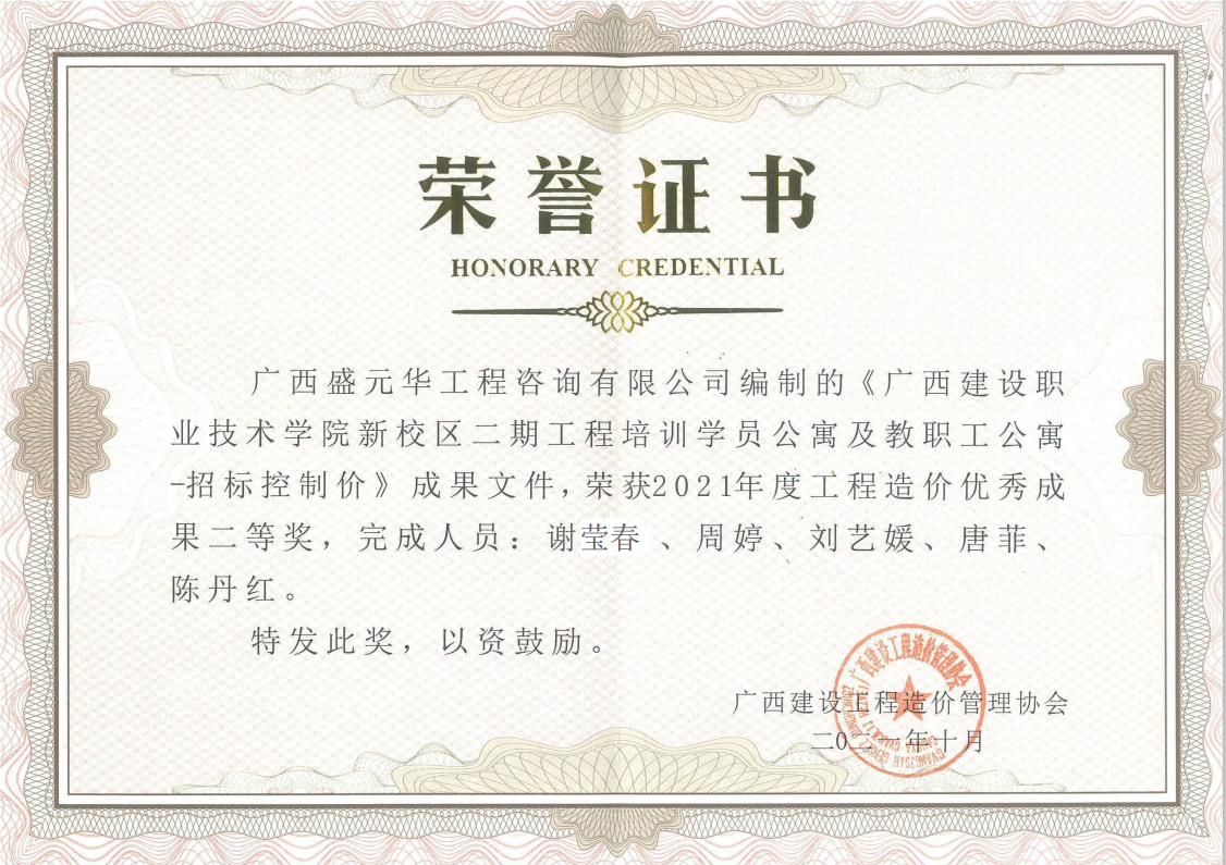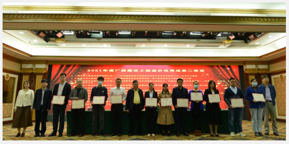 大会表彰了荣获2021年度广西建设工程造价优秀成果奖的65家单位,其中我公司编制的《广西建设职业技术学院新校区二期工程培训学员公寓及教职工公寓——招标控制价》成果文件,荣获2021年度广西建设工程造价优秀成果奖二等奖。据悉,我公司已有多个项目连年获得广西建设工程造价优秀成果奖。